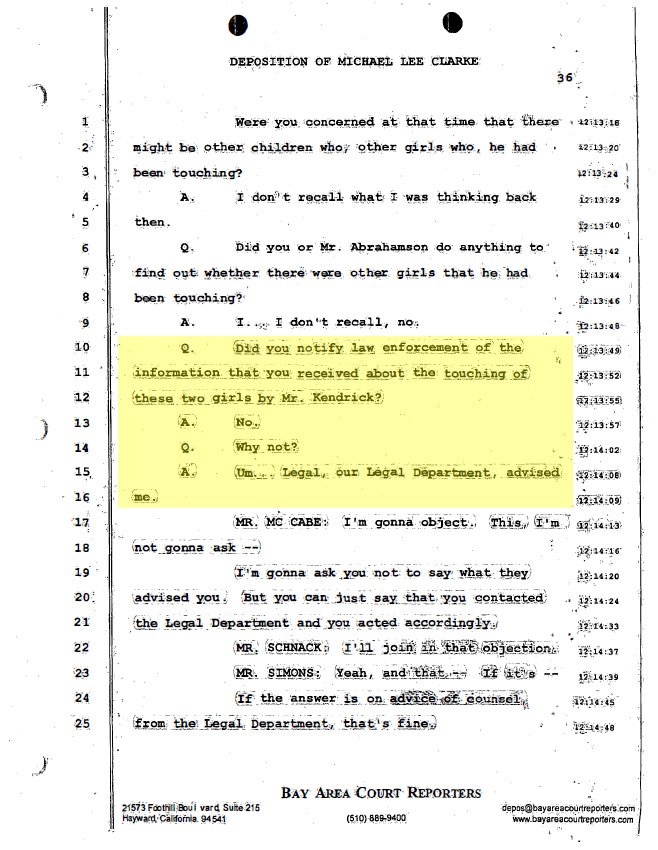 注記: この裁判において,長老たちが警察に事件を報告したかどうかが審議されていたわけではありません。(当時カリフォルニア州では聖職者の児童虐待報告義務は法律で定められていませんでした)。上記の質疑からわかるのは協会の法律部門が地元の長老たちに捜査当局には通報しないようにと指導していたという点です。