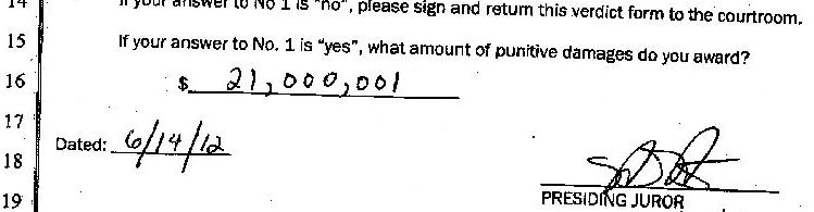 この裁判で陪審員は原告側が求めた賠償金に対して1ドルを加算した額を裁定しました。これは同類の裁判内容ではアメリカ裁判史上最高額になります。