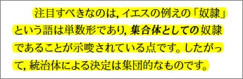 なぜ例え話の中に出てくる登場人物が単数形であることが「集合体として」の意味があるという結論になるのでしょうか?イエスの例え話は多くの場合に単数形の登場人物あるいは物を使っています。それらも「集合体として」の意味を持つと説明すべきでしょう。結局のところ,ものみの塔は新たな見解に合わせて聖句のつまみ食いをしているにすぎません。そのような手法は自己中心的な解釈をもたらします。