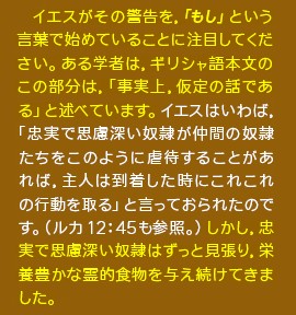 (マタイ 24:45‐51) 「主人が,時に応じてその召使いたちに食物を与えさせるため,彼らの上に任命した,忠実で思慮深い奴隷はいったいだれでしょうか。46 主人が到着して,そうしているところを見るならば,その奴隷は幸いです。47 あなた方に真実に言いますが,[主人]は彼を任命して自分のすべての持ち物をつかさどらせるでしょう。 48 しかし,もしそのよこしまな奴隷が,心の中で,『わたしの主人は遅れている』と言い,49 仲間の奴隷たちをたたき始め,のんだくれたちと共に食べたり飲んだりするようなことがあるならば,50 その奴隷の主人は,彼の予期していない日,彼の知らない時刻に来て,51 最も厳しく彼を罰し,その受け分を偽善者たちと共にならせるでしょう。そこで[彼は]泣き悲しんだり歯ぎしりしたりするのです。