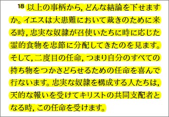 さらに25ページの結論の部分では奇妙にも見える文章が続きます。将来のイエスの行動をあらかじめ決めて書いています。「イエスが来る時,~を見ます」「イエスは二度目の…任命を喜んで行います」。自分たちで評価を決めて,まるで主人は自分たちの評価に従って行動すべきであるかのような言い回しにも見えます。