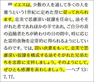 ものみの塔は「忠実で思慮深い奴隷」に関する例え話を自分たちの権威を証拠づけるものとして使用してきました。ものみの塔はこれまで何度も「真理」を変更してきましたが,その度に聖書の言葉のチェリーピッキング(つまみ食い)をしてきました。例えば22ページの10節では以下のような説明をしています。